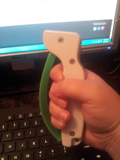 It is fairly small. I can grip it easily, and my hands are very small (I can wear kid sized gloves). Its comfortable and affords a great grip for safety and a knuckle cover for those oopsie-dents that can occur.